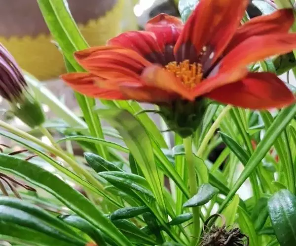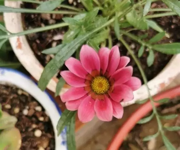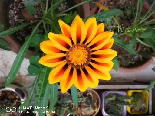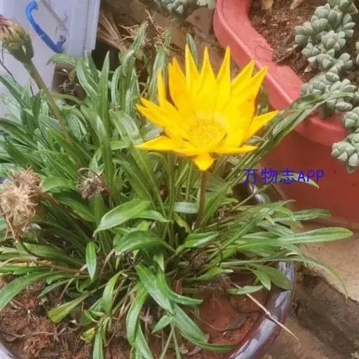 勋章菊(学名:Gazania rigens Moench)是菊科,勋章菊属多年生草本植物,株高可达40厘米,叶由根际丛生,叶片披针形或倒卵状披针形,叶背密被白毛,叶形丰富。头状花序单生,舌状花和管状花两种,花色丰富多彩,有白、黄、橙红等色,花瓣有光泽,花心处多有黑色、褐色5-10月开花。