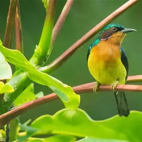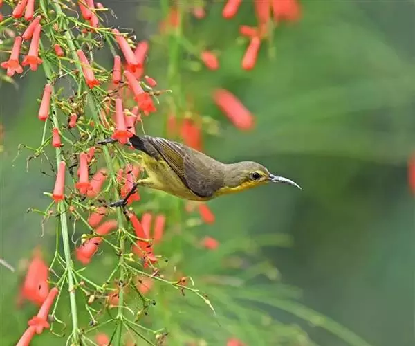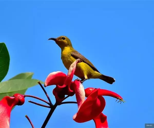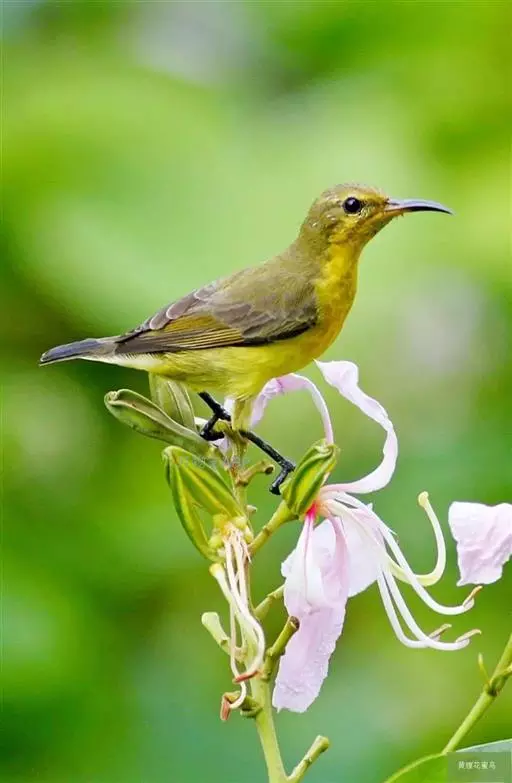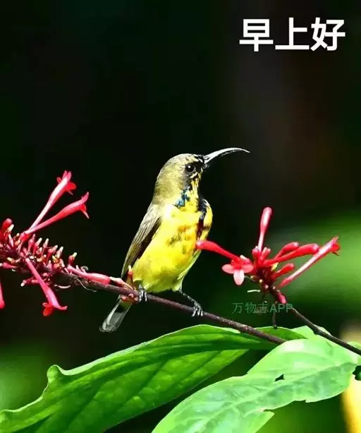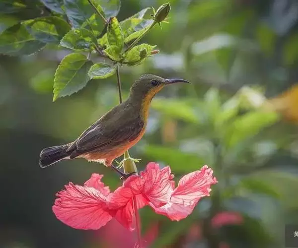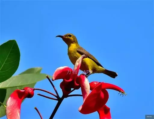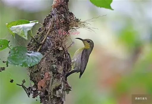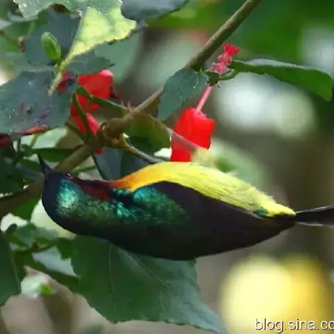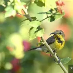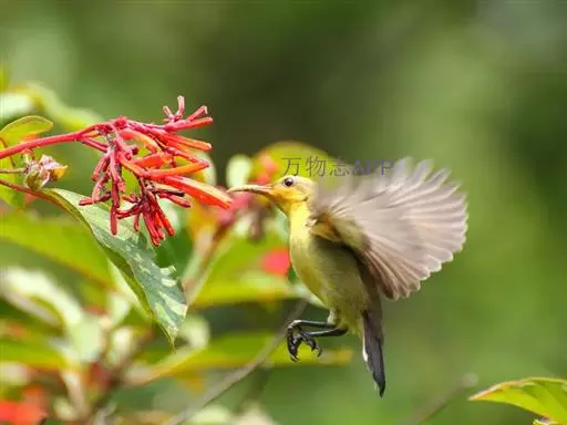 叉尾太阳鸟,雀形目太阳鸟科太阳鸟属留鸟;为小型鸟类,雄鸟头顶辉蓝绿色,上体橄榄绿色,腰明黄色,…