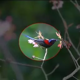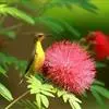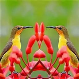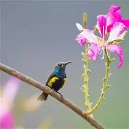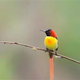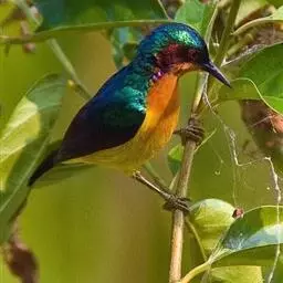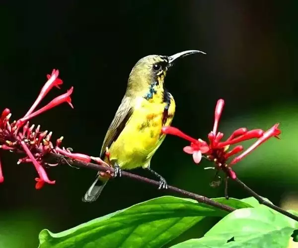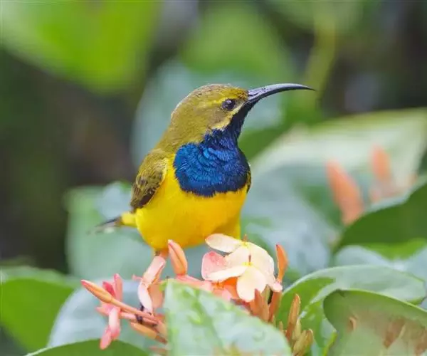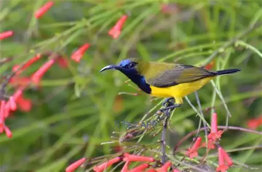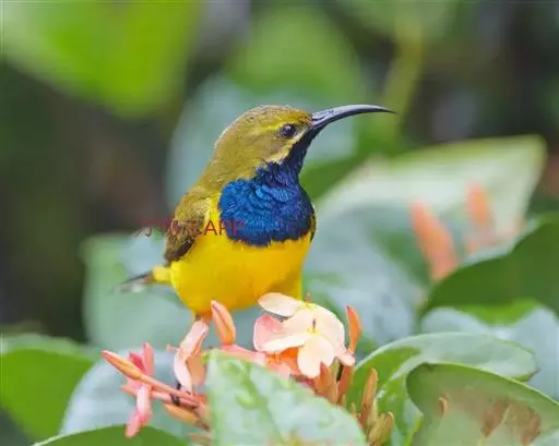 黄腹花蜜鸟(学名:Cinnyris jugularis):为太阳鸟科花蜜鸟属的鸟类。体重5-9克,体长97-115毫米。是一种体型小的花蜜鸟。腹部灰白。雄鸟颏及胸金属黑紫色,有绯红及灰色胸带,具艳橙黄色丝质羽的肩斑,上体橄榄绿色,繁殖期后金属紫色缩小至喉中心的狭窄条纹。雌鸟无黑色,上体橄榄绿色,下体黄,通常具浅黄色的眉纹。虹膜深褐色,嘴及脚黑色。