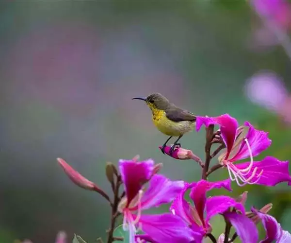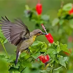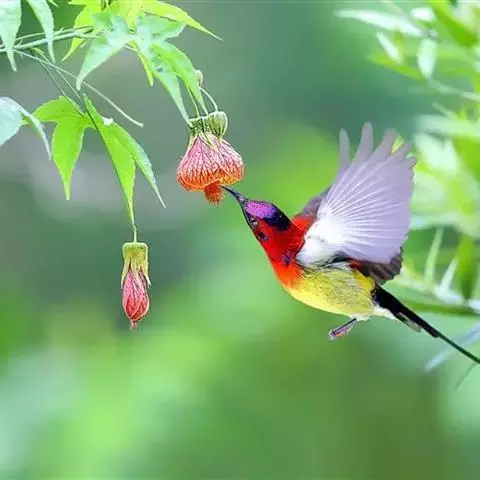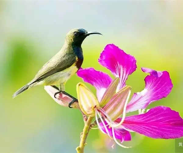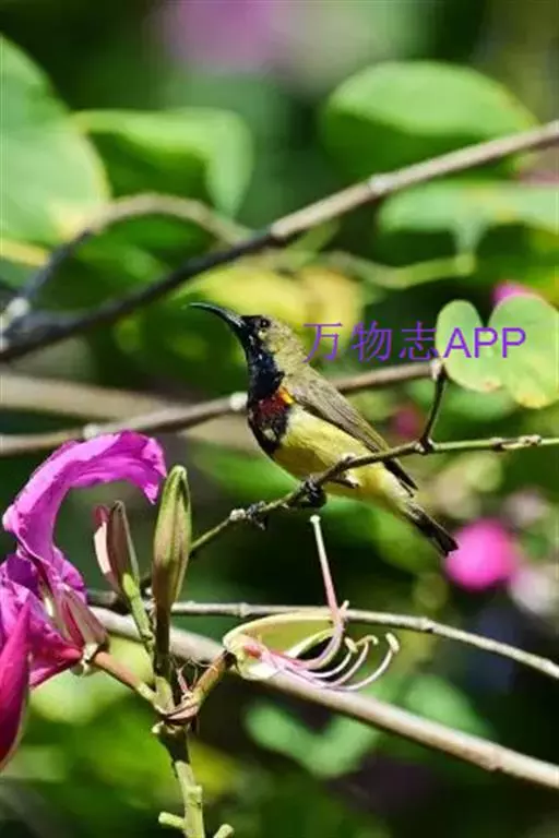 黑胸太阳鸟:小型鸟类,体长9-15厘米。嘴细长而向下曲。雄鸟中央尾羽特长,尾呈楔形,…
