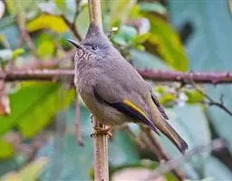 雌鸟上体浅褐色,腰沾绿色,眼前上方有一短的、不甚明显的黄色眉纹。颊、颏、喉黄色或污黄色,喉中央较浅淡,其余似雄鸟。