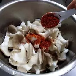 8.把花椒面放入锅中,翻炒;