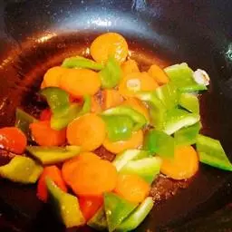 3.放入豆瓣酱炒出红油后,放入彩椒粒炒匀,然后倒入切成块的豆腐翻炒,烧约2分钟;