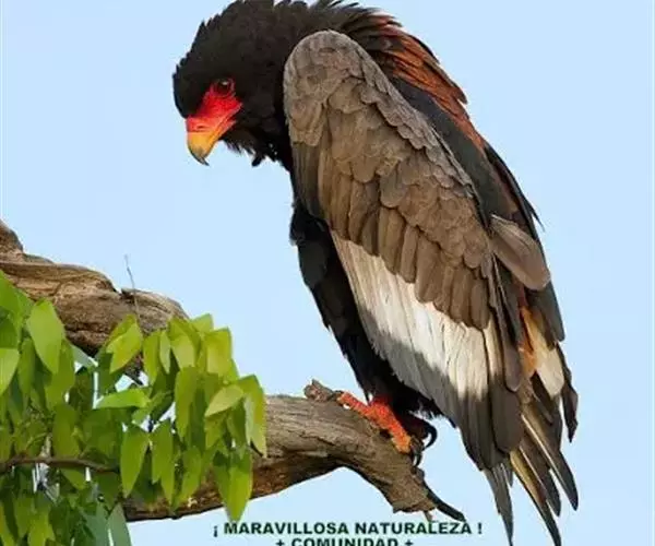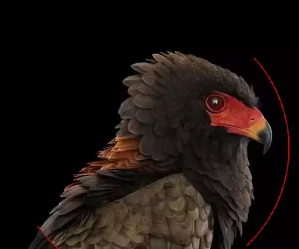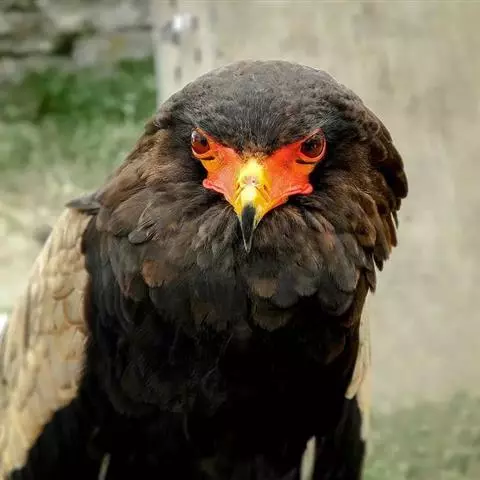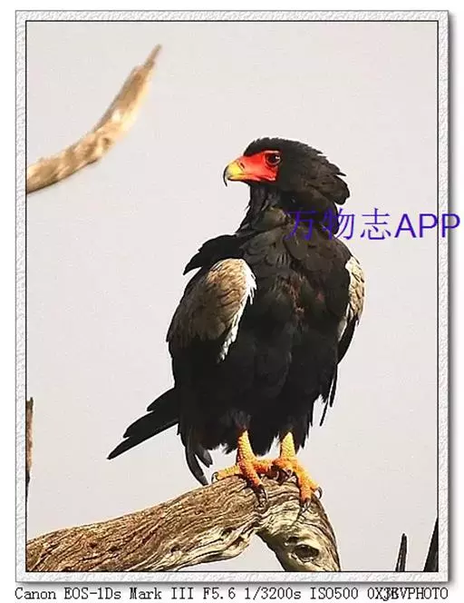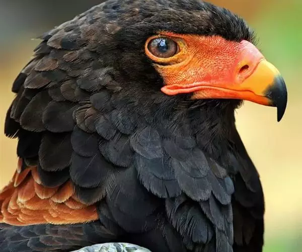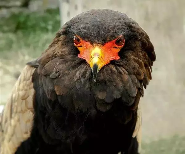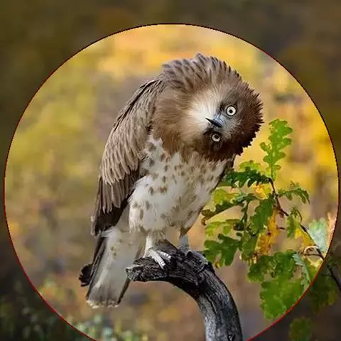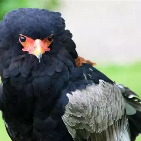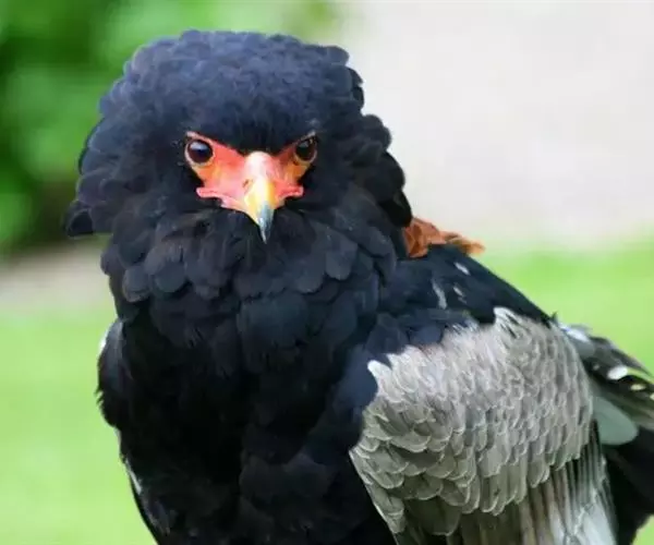 短尾雕也是一种大型食蛇的猛禽,在俄文里它被称为“小丑雕” (ОРЁЛ-СКОМОРОХ),因为它像马戏团的小丑将脸庞涂抹的红彤彤的,而且它还“套了一条鲜红色紧身裤”(它的腿也是红色的)。它的翅膀长而尾巴短,当它静止时收拢的翅膀完全掩蔽了尾部,好象它的尾巴一样。有人说短尾雕是飞机的原型。它身上的羽毛以黑色为主,椭圆的一枚枚羽毛支棱着,蓬松、美丽。在它的背上装饰着两块棕色的斑块,每一枚羽毛有清晰的圆形的羽缘,象精致的花边。