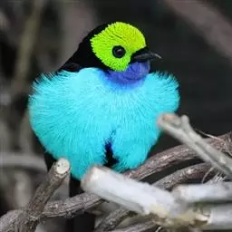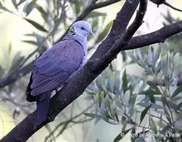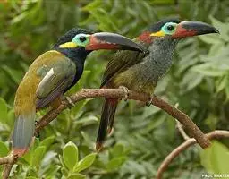 雌鸟和雄鸟的羽色相似,但胸部没有紫色和橙色的带斑,与腹部同为绿黄色,尾下覆羽较淡,为淡棕黄色,背部、肩部有较多棕褐色。