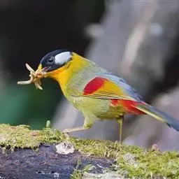 银耳相思鸟小型鸟类,体长14~18厘米。头顶黑色,耳羽银灰色,前额橙黄色;外侧飞羽橙黄色,基部朱红色,…
