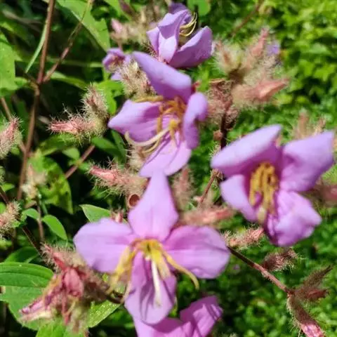 星毛金锦香,为野牡丹科、金锦香属灌木,高1—1.5米;茎四棱形,被密或疏平贴的糙伏毛。叶片纸质,披针形至卵状披针形,稀卵形,顶端渐尖,基部钝或近圆形。长6-10厘米,宽1,8-3.4厘米,有时长6—9.2厘米,宽2.5—4厘米,全缘或具微微地不明显的细锯齿,具缘毛,两面被糙伏毛,基出脉5,面仅脉上被毛;叶柄长5—11(-18)毫米,密被糙伏毛。