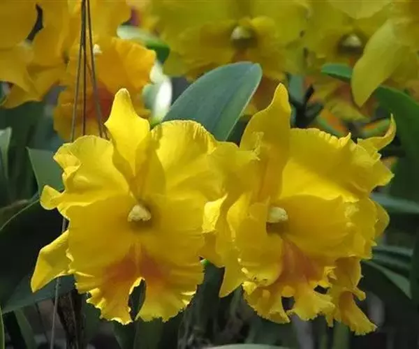 黄花重瓣的有迪克·怀尔登、副冠深橙色的塔希提、副冠橙色的得克萨斯和多头的黄乐。