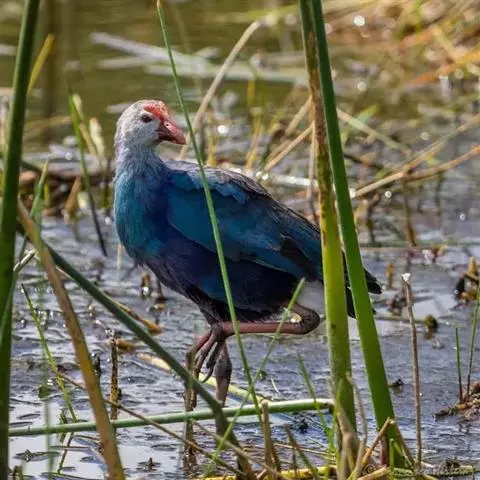 紫水鸡(学名:Porphyrio porphyrio)是鹤形目秧鸡科的鸟类,中型涉禽,共有13个亚种。体长约44厘米。嘴粗壮,鲜红色,短而侧扁;鼻沟浅而宽,鼻孔小而圆,在鼻沟前部下方,额甲宽大,后缘呈截形,橙红色。翅圆形,第2枚、第3枚和第4枚初级飞羽最长,并几乎等长;第1枚和第6枚或第7枚初级飞羽等长。跗蹠和趾长而有力,暗红色;能用脚趾抓住和操纵食物,这在秧鸡科中很特殊。两性同型,体羽大都为紫色或蓝色,尾下覆羽白色,翅和胸蓝绿色。栖息于江河、湖泊周围的沼泽地和芦苇丛中。以昆虫、软体动物、水草等为食。