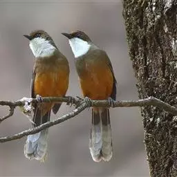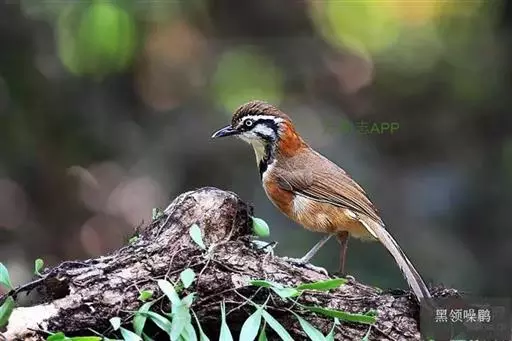 黑领噪鹛(学名:Garrulax pectoralis):中型鸟类,体长28-30cm。上体棕褐色。后颈栗棕色,形成半领环状。眼先棕白色,白色眉纹长而显著,耳羽黑色而杂有白纹。下体几全为白色,胸有一黑色环带,两端多与黑色颧纹相接。
