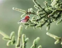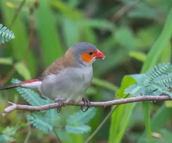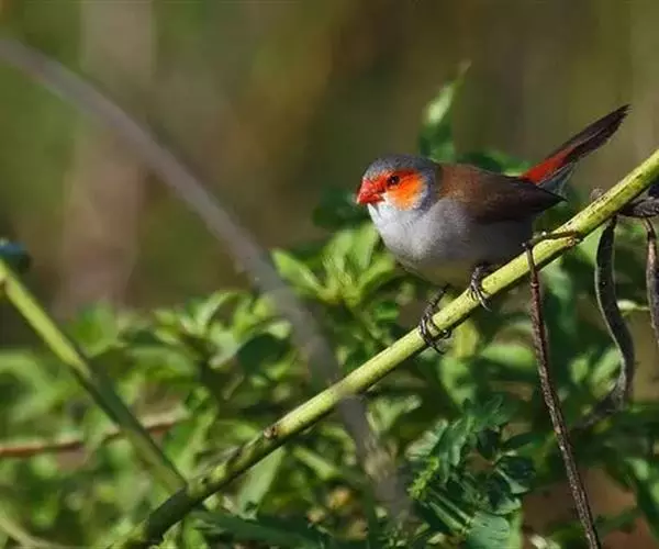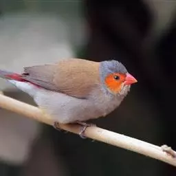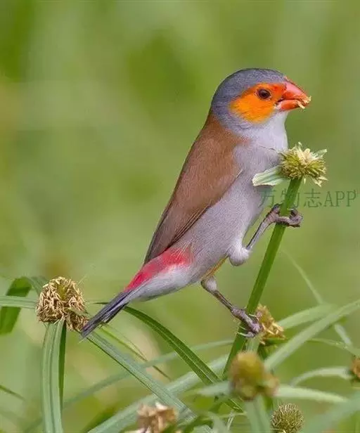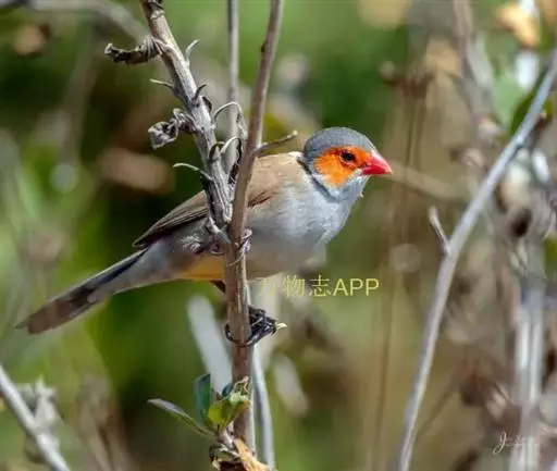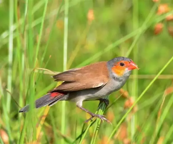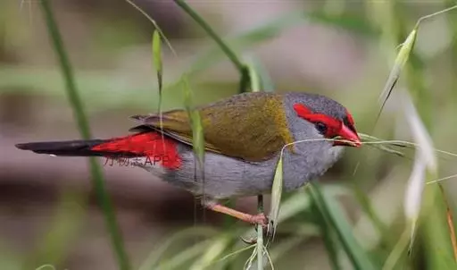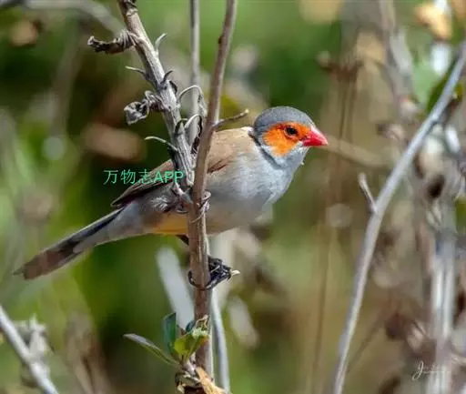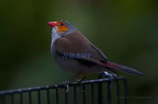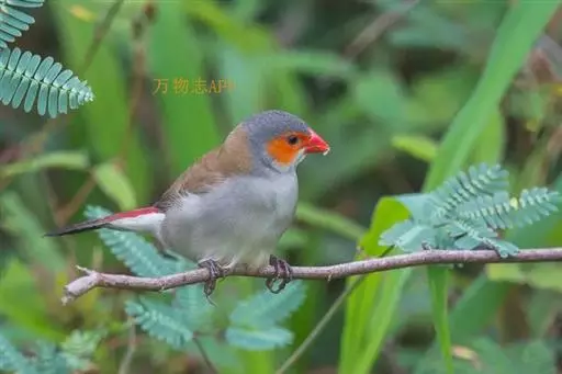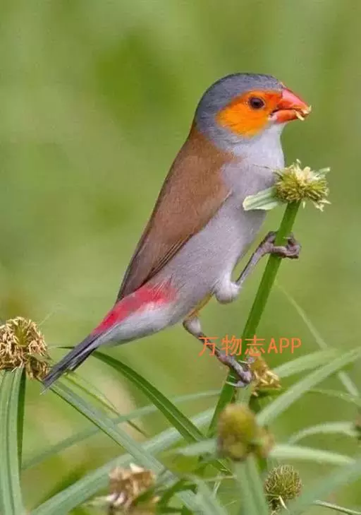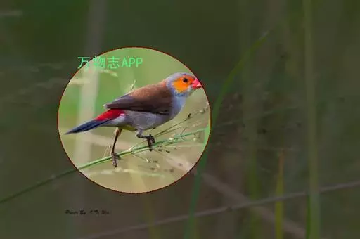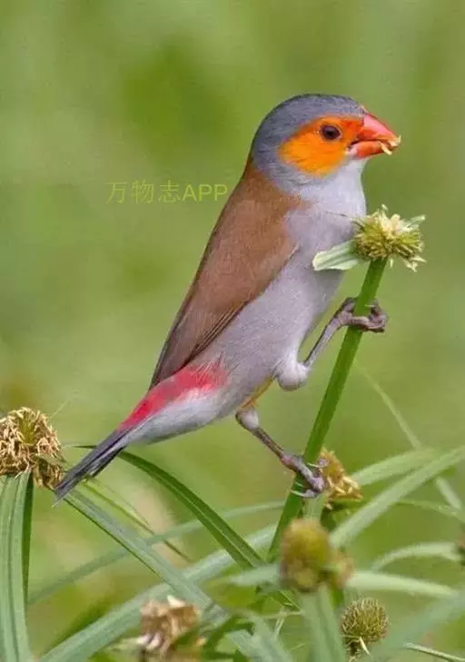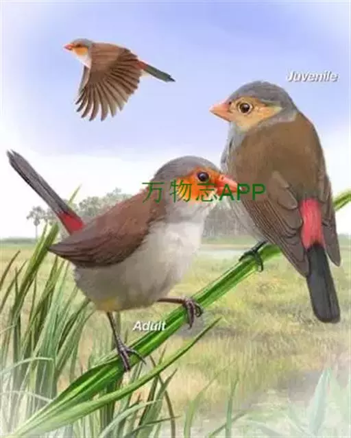 尾上覆羽:雄鸟具红色的尾上覆羽,此为橙颊梅花雀独有的特征