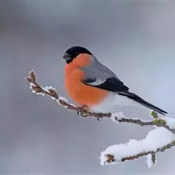 体长约 17cm,雌雄鸟的羽色相同。喙粗短而呈红色,虹膜黑褐色,头部大致为灰色,但脸为亮橙色,背及翼羽褐色,腰鲜红色,喉、胸、腹及尾下覆羽淡灰色,尾羽暗褐色,脚铅黑色。