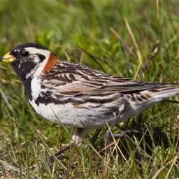 栗斑腹鹀:属小型鸣禽。体重19-25克,体长145-167毫米。头顶至背栗红色,眼先和颧纹黑褐色,…
