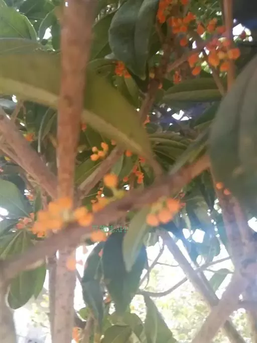 聚伞花序簇生于叶腋,或近于帚状,每腋内有花多朵;苞片宽卵形,质厚,长2-4毫米,具小尖头,无毛;花梗细弱,长4-10毫米,无毛;花极芳香;花萼长约1毫米,裂片稍不整齐;花冠黄白色、淡黄色、黄色或桔红色,长3-4毫米,花冠管仅长0.5-1毫米;雄蕊着生于花冠管中部,花丝极短,长约0.5毫米,花药长约1毫米,药隔在花药先端稍延伸呈不明显的小尖头;雌蕊长约1.5毫米,花柱长约0.5毫米。果歪斜,椭圆形,长1-1.5厘米,呈紫黑色。花期9-10月上旬,果期翌年3月。
