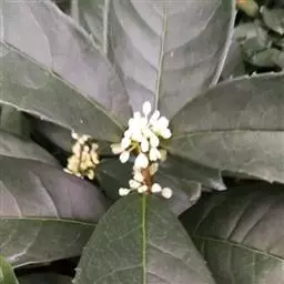 晚银桂:叶缘微波曲,基本全缘偶先端有粗尖锯齿。叶面微凹,叶先端短尖,基部宽楔形。一年可开花2次,花期9月下旬与10月上旬,持续6天,每花序有花6-7朵,着花中等,香气中等。花瓣圆形,四裂几全裂,花冠近白色,平展,雄蕊2,子房退化。