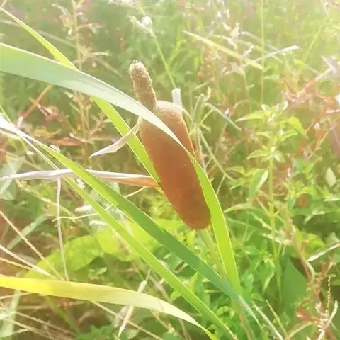 香蒲 多年生水生或沼生草本。根状茎乳白色。地上茎粗壮,向上渐细,高1.3-2米。叶片条形,长40-70厘米,宽0.4-0.9厘米,光滑无毛,上部扁平,下部腹面微凹,背面逐渐隆起呈凸形,横切面呈半圆形,细胞间隙大,海绵状;叶鞘抱茎。