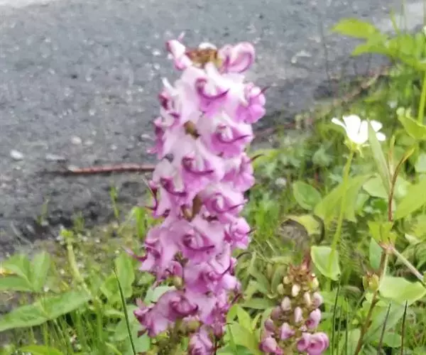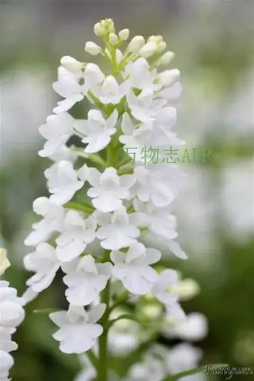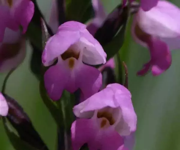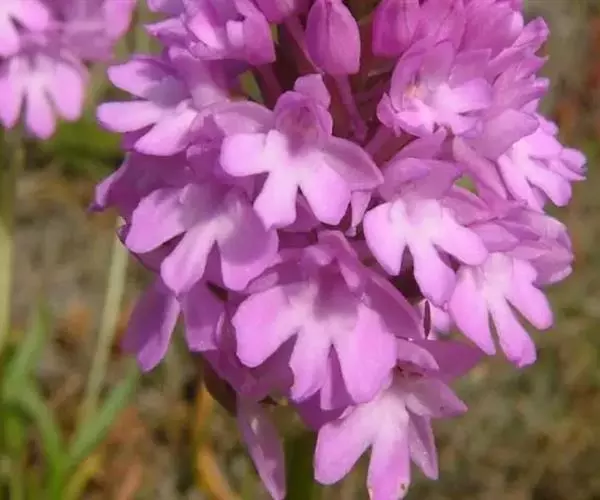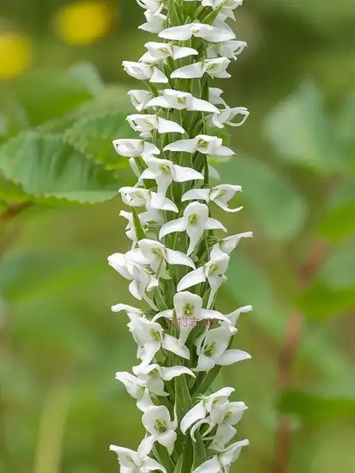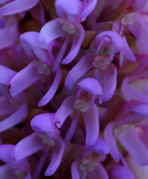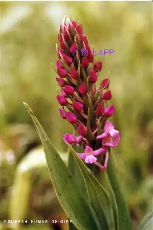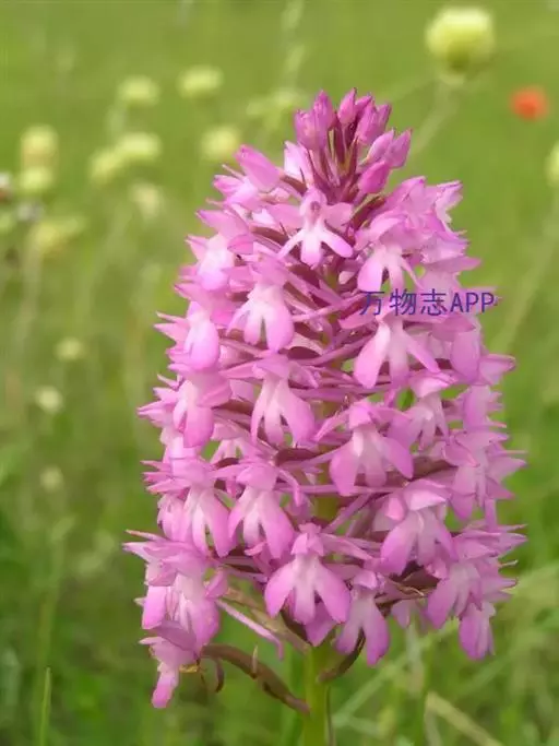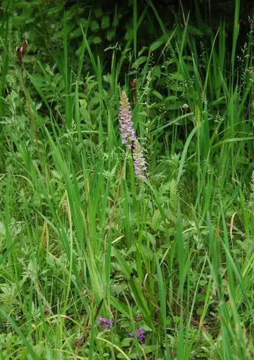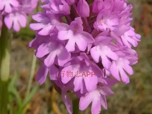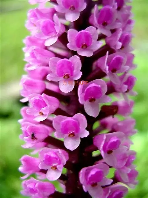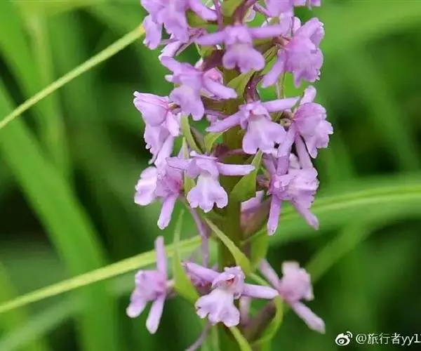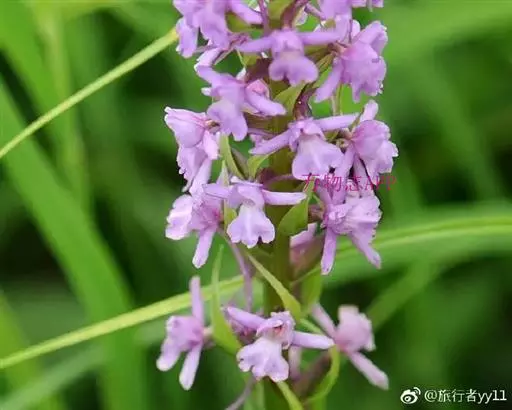 总状花序具多数密生的花,圆柱形,长5.5-15厘米;花苞片披针形,直立伸展,先端长渐尖成尾状,长于或等长于花;子房纺锤形,顶部稍弧曲,连花梗长约8毫米;花粉红色,罕为粉白色;中萼片宽椭圆形或宽卵状椭圆形,长3.5-5毫米,宽3-4毫米,先端急尖,略呈兜状,具3脉;侧萼片斜卵形,反折,边缘向外卷,较中萼片稍长或几等长,先端急尖,具3脉,前面的1条脉常具支脉;花瓣直立,斜卵状三角形,与中萼片等长,与侧萼片近等宽,边缘具细锯齿,先端急尖,具3脉,前面的1条脉常具支脉,与中萼片相靠;唇瓣向前伸展,宽倒卵形,长4-5毫米,前部3裂,中裂片较侧裂片大,三角形,先端钝或急尖;距细而长,狭圆筒形,下垂,长约1厘米,稍向前弯,向末端略增粗或略渐狭,长于子房;花粉团卵球形,具细长的柄和粘盘,粘盘线状披针形。花期6-8月。