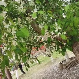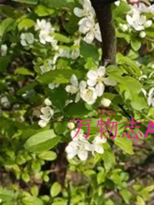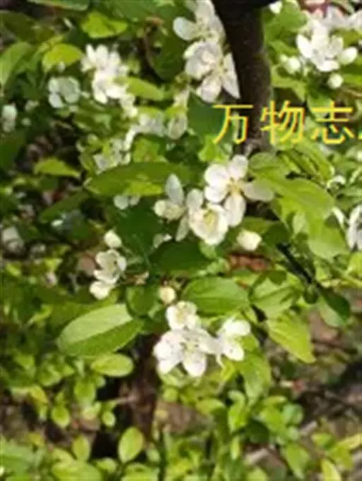 近似伞形花序,具花4-8朵,花梗长2-4厘米,被柔毛;苞片膜质,披针形,早落;花直径2.5-3厘米;萼筒钟形,密被长柔毛;萼片三角披针形,先端急尖或渐尖,全缘,外面有稀疏柔毛或近于无毛,内面密被柔毛,比萼筒稍长或近于等长;花瓣倒卵形,长1.2-1.5厘米,宽5-8厘米,白色,基部有短爪;雄蕊25,花丝长短不等,长不及花瓣之半;花柱4-5。基部有长柔毛,柱头扁圆,比雄蕊稍长。果实卵形或近球形,直径1-1.5厘米,红色,萼片脱落很迟,萼洼微隆起;果梗长2-4厘米,有长柔毛。花期5-6月,果期9月。