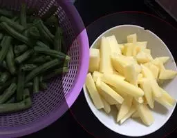 1、准备好材料:猪肉洗净切好、四季豆洗净摘好