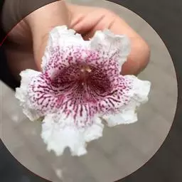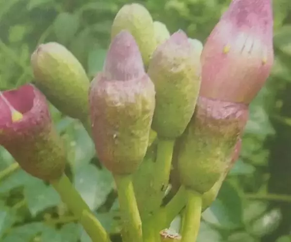 木蝴蝶 直立小乔木,高6-10米,胸径15-20厘米,树皮灰褐色。大型奇数2-3 (-4)回羽状复叶,着生于茎干近顶端,长60-130厘米;小叶三角状卵形,长5-13厘米,宽3-10厘米,顶端短渐尖,基部近圆形或心形,偏斜,两面无毛,全缘,叶片千后发蓝色,侧脉5-6对网脉在叶下面明显。总状聚伞花序顶生,粗壮,长40-150厘米;花梗长3-7厘米;花大、紫红色。花萼钟状,紫色,膜质,果期近木质,长2.2-4.5厘米,宽2-3厘米,光滑,顶端平截,具小苞片。花冠肉质,长3-9厘米,基部粗1-1.5厘米,口部直径5.5-8厘米;檐部下唇3裂,上唇2裂,裂片微反折,花冠在傍晚开放,有恶臭气味。雄蕊插生于花冠筒中部,花丝长4厘米,微伸出花冠外,花丝基部被绵毛,花药椭圆形,长8-10毫米,略叉开。花盘大,肉质,5浅裂,厚4-5毫米,直径约1.5厘米。花柱长5-7厘米,柱头2片开裂,长约7毫米,宽约5毫米 ,花期7月至10月。