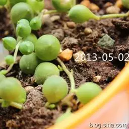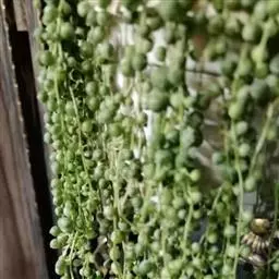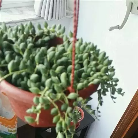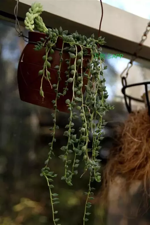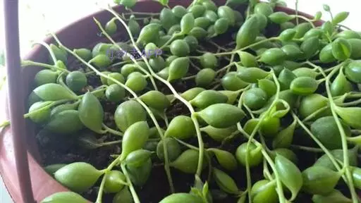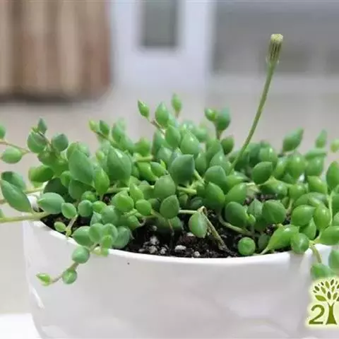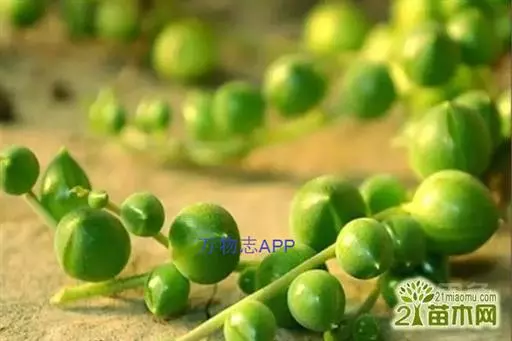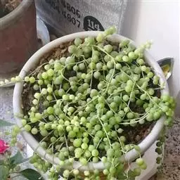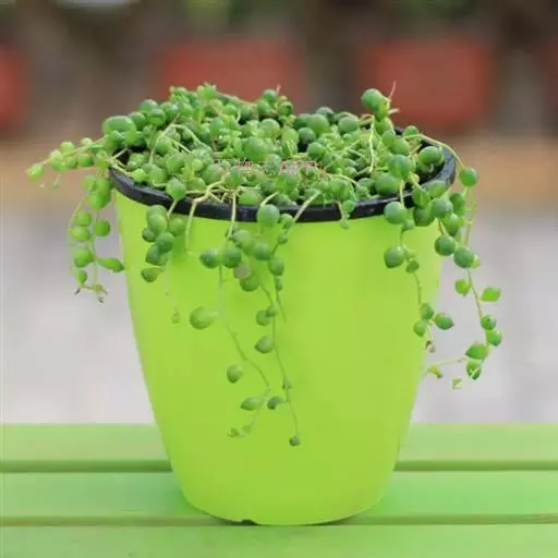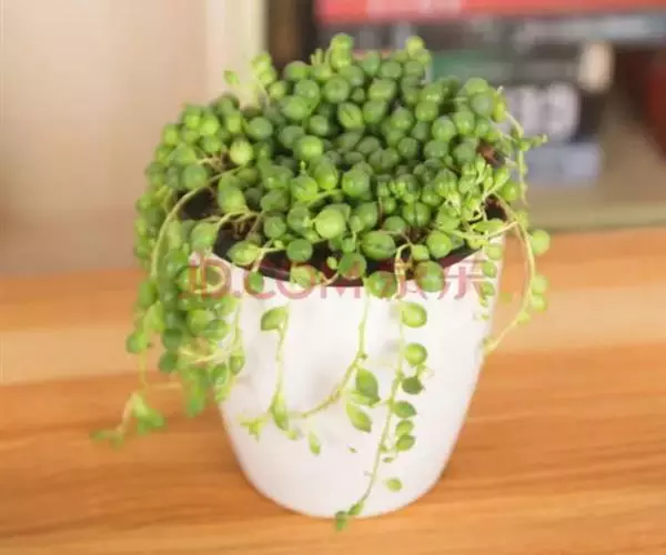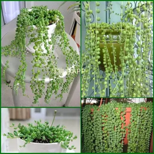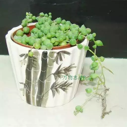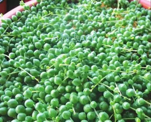 珍珠吊兰(Senecio rowleyanus H. Jacobsen) 因鼓鼓、饱满翠绿的椭圆形小叶子形似珍珠状而得名。又名翡翠珠、佛珠吊兰、翡翠珠、绿之铃,绿铃。菊科千里光属多肉植物,花期一般是当年的12月至翌年1月。