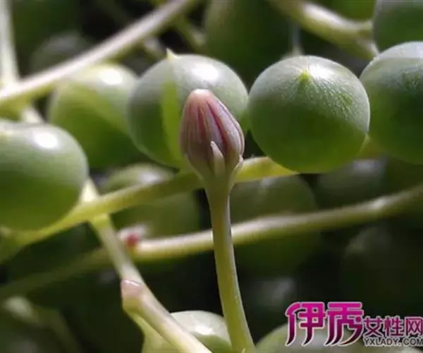 一粒粒圆润的、肥厚的圆心形叶片,似一串串风铃在风中摇曳,这就是它的叶子。因叶互生,生长较疏,圆 心形,深绿色,肥厚多汁,似珠子,故有“佛串珠”、“佛珠"、”绿葡萄“、”绿之铃“之美称。还有人称它为”佛珠吊兰“、”情人泪"。它的茎纤细,头状花序,顶生,长3~4厘米,呈弯钩形,花白色或褐色,花蕾是红色的细条。