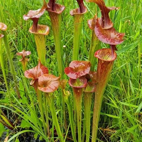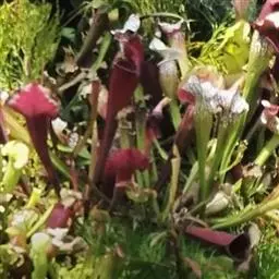 紫瓶子草(学名:Sarracenia purpurea)是多年生草本植物,也是瓶子草属的食虫植物里最矮小的品种,具有紫色的瓶子,瓶子很小,大约只有30厘米长,生长着偏向一侧的花朵,颜色鲜艳,亚种和变种很多。形态和猪笼草的笼子相似,能分泌蜜汁和消化液,受蜜汁引诱的昆虫失足掉落瓶中,瓶内的消化液会把昆虫消化吸收。生长范围几乎遍布美国东海岸、大湖区和加拿大东南部,成为最常见且广泛分布的瓶子植物。它也是唯一可以居住在冷温带的瓶子草属植物。