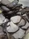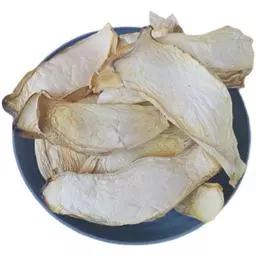 菌片烘烤可用烘干机或烘房,量少时也可用红外线灯或无烟木炭进行烘烤。烘烤起始温度为35℃,以后每小时升高1℃,升到60℃持续1小时后,又逐渐将温度降至50℃。烘烤前期应启动通风窗,烘烤过程中通风窗逐渐缩小直至关闭。一般需烘烤10小时左右,采取一次性烘干,烘至菌片含水量降至于12%以下为止。鲜片含水量大时,温度递增的速度应放慢些,骤然升温或温度过高会造成菌片软熟或焦脆。烘烤期间应根据菌片的干燥程度,适当调换筛位,使菌片均匀脱水。