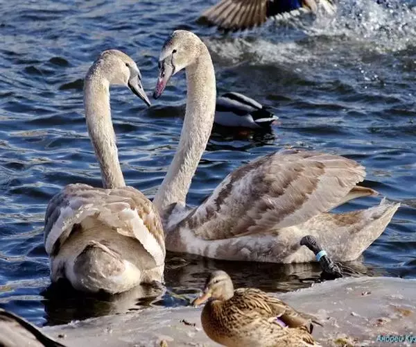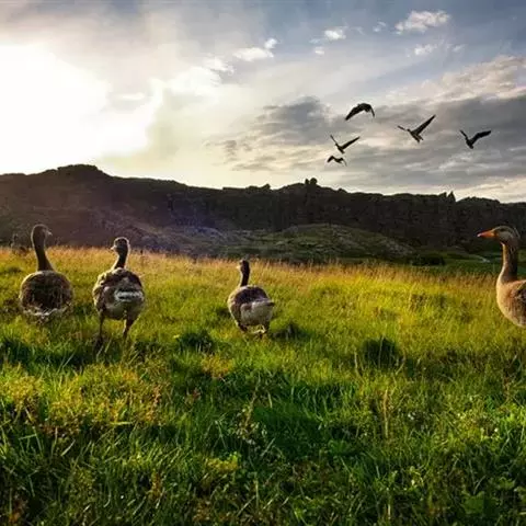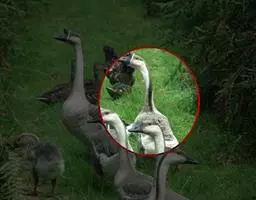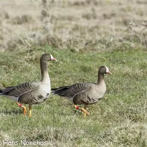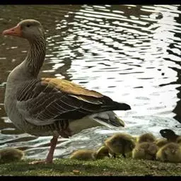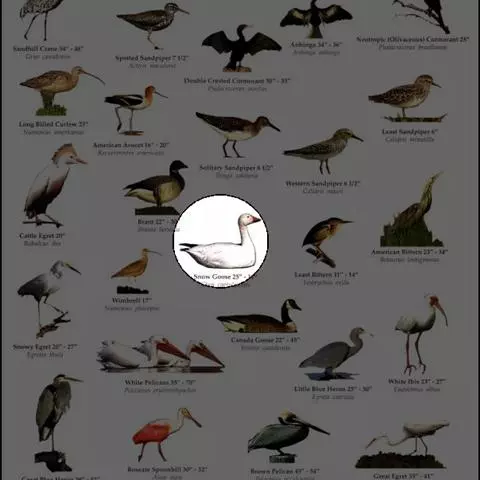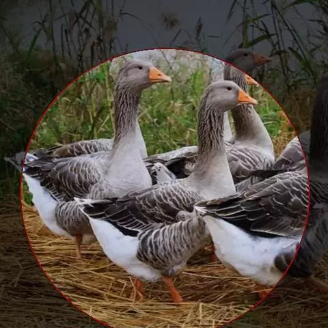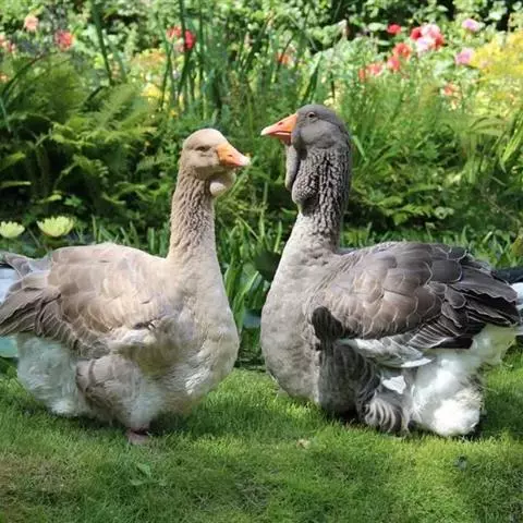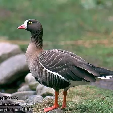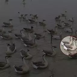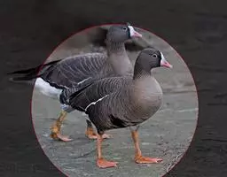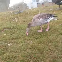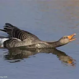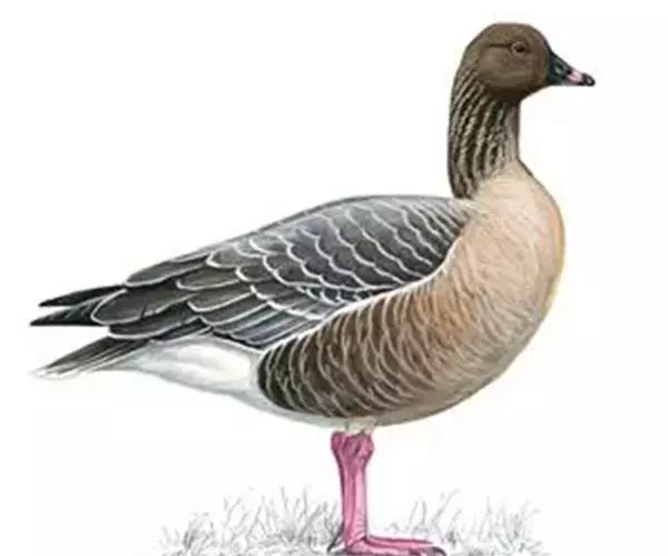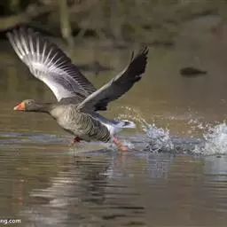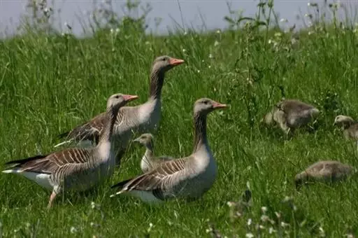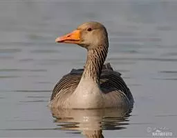 灰雁(学名:Anser anser):体长70-90厘米,翼展147-182厘米,体重2.5-4千克,寿命17年。体大而肥胖。嘴、脚肉色,上体灰褐色,下体污白色,飞行时双翼拍打用力,振翅频率高。脖子较长。腿位于身体的中心支点,行走自如。有扁平的喙,边缘锯齿状,有助于过滤食物。