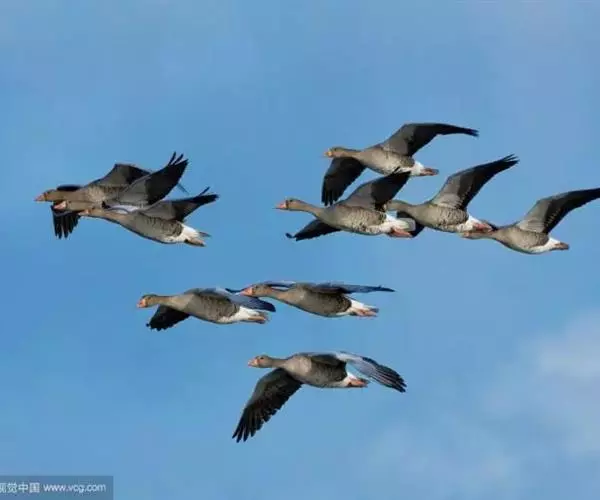 灰雁3月末至4月初成群从南方越冬地迁到中国黑龙江、内蒙古、甘肃、青海、新疆等北部地区繁殖,9月末开始成群迁往中国南方越冬,大批迁徙在10月初至10月末,少数持续到11月初,人们曾于1992年10月中旬至10月末在吉林省西部草原见到3000只的大群。飞行时两翅扇动缓慢,显得有些笨拙,但较有力,不慌不忙,徐徐而飞,成单列或“V”字形队形。飞行高度亦很高,通常晚上迁徙,白天休息和觅食。有时边飞边叫,鸣声宏亮、清脆而高。