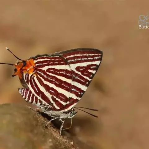 红珠灰蝶翅白色,半透明羽毛状。前翅及前缘布各有一层橙色鳞片。中室中部及横脉处各有不同大小黑色斑。…
