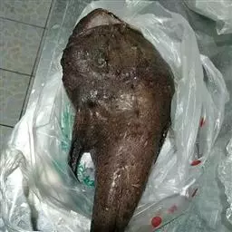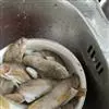 4. 炒勺加油,烧至七八成热,先下鱼头段,后下鱼尾段。下入板油、蒜丁呈金黄色一起捞出;