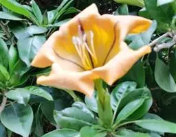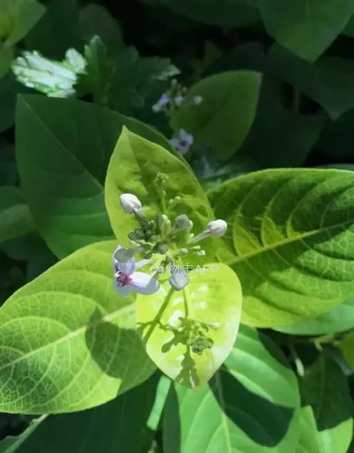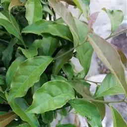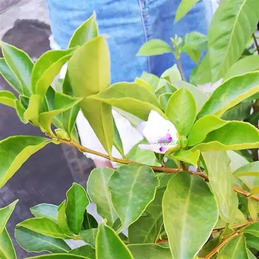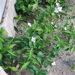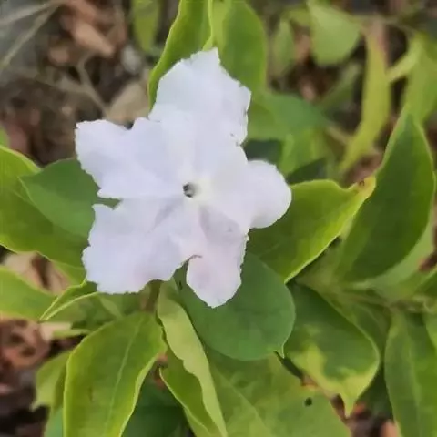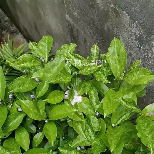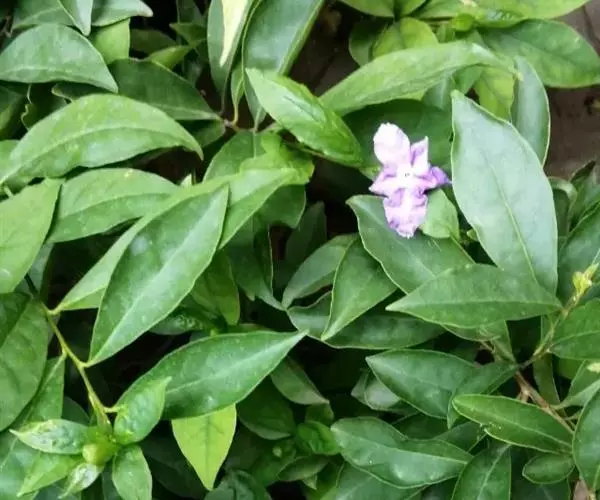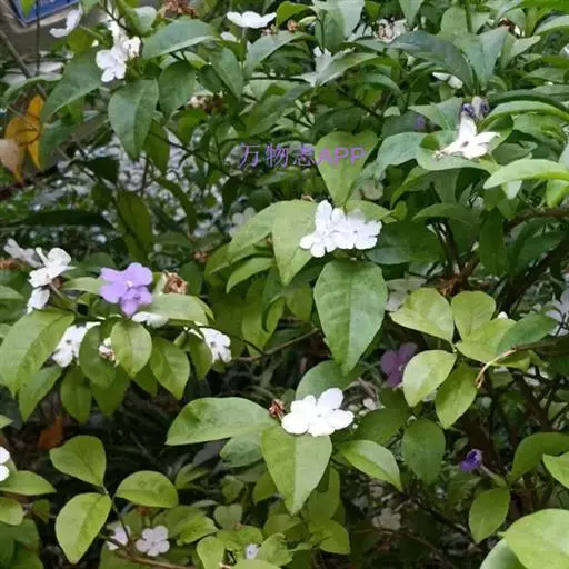 多年生常绿灌木,是华北夏季露天摆放和冬季室内布置 鸳鸯茉莉 的优良盆栽花卉。植株高约70~150厘米,盆栽经矮化后,株高可降低到30cm~60cm。茎皮成深褐色或灰白色,分枝力强,周皮纵裂。单叶互生,长披针形或椭圆形,先端渐尖,具短柄,口十面草绿色。叶长5~7厘米,宽1.7~2.5厘米,纸质,腹面绿色,背面黄绿色,叶缘略波皱。