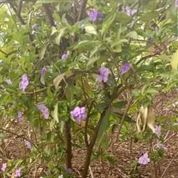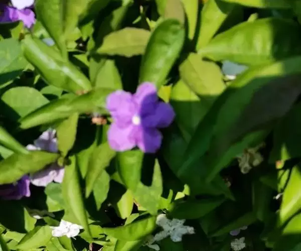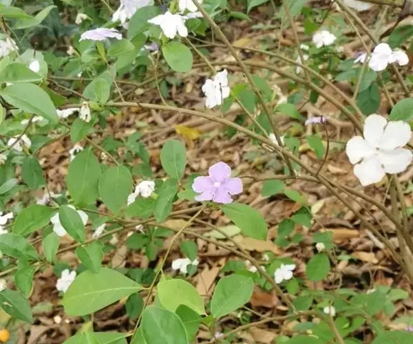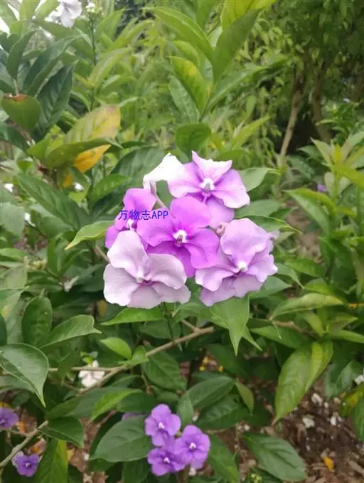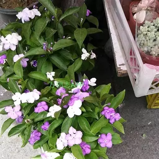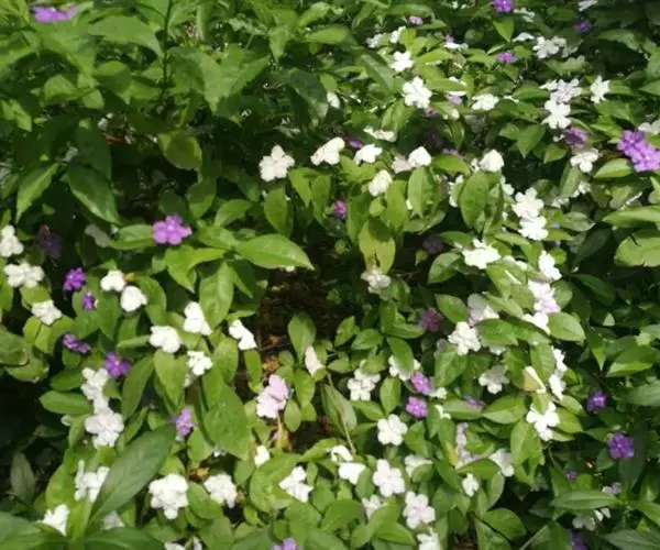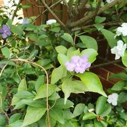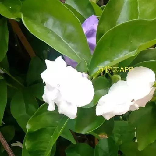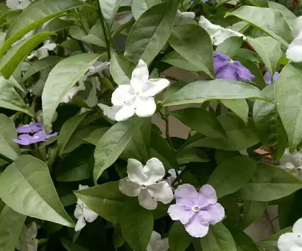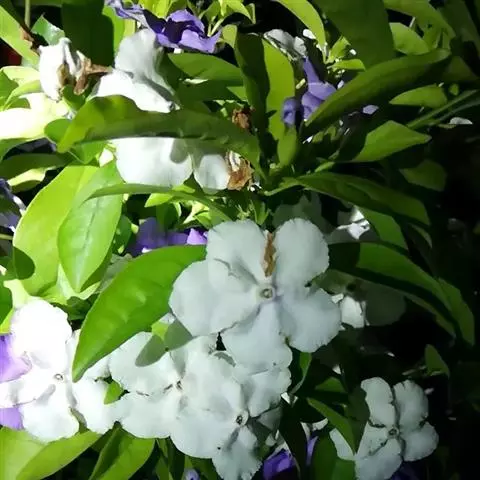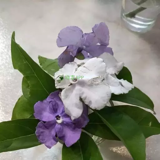 鸳鸯茉莉(Brunfelsia latifolia Benth.)属茄科鸳鸯茉莉属常绿矮灌木,是华北夏季露天摆放和冬季室内布置的优良盆栽花卉。鸳鸯茉莉高50至100厘米,单叶互生,花大多单生,少有数朵聚生的。花冠呈高脚碟状,有浅裂,花期4月至10月,单花开放5天左右。花朵初开为蓝紫色,渐变为雪青色,最后变为白色,由于花开有先后,在同株上能同时见到蓝紫色和白色的花,故又叫双色茉莉,其英文名之意为“昨天、今天、明天”,这形象地描绘出其花色的特殊变化。