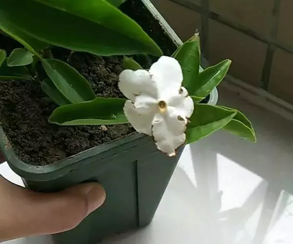 花单朵或数朵簇生,有时数朵组成聚伞花序。花冠成高脚碟状,有浅裂。花冠直径4cm~5cm,花萼呈简状,雄蕊和雌蕊座落在花冠中心的小孔上。花单生或2~3朵簇生于叶腋,高脚碟状花,花冠五裂,花瓣锯齿明显。花初含苞待放时为蘑菇状、深紫色,初开时蓝紫色,以后渐成淡雪青色,最后变成白色,单花可开放3至5天。 花香浓郁,香味也不同于普通的茉莉花香。