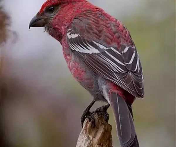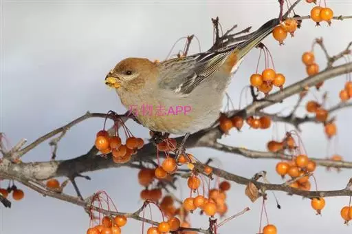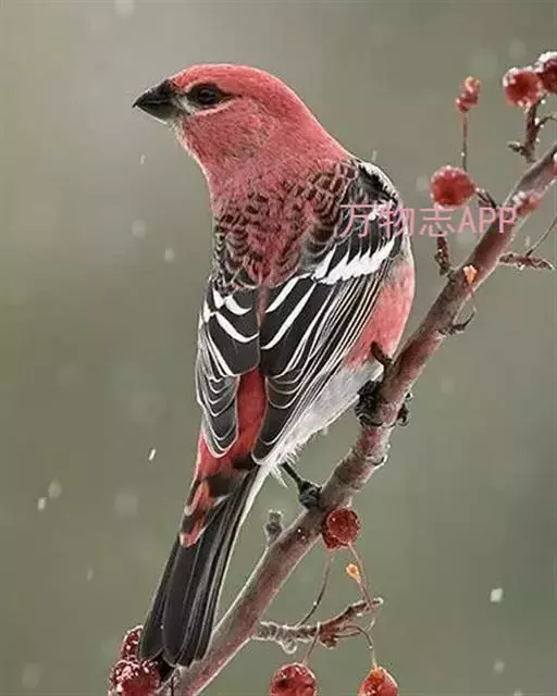 松雀(学名:Pinicola enucleator):体重48-57克,体长192-213毫米。是一种体型较大而尾长的雀。嘴厚而带钩,两道明显白色翼斑与近黑的翼成对比。成年雄鸟深粉红色,具别致的脸部灰色图纹。成年雌鸟似雄鸟但橄榄绿色取代粉红色。是一种非常漂亮的鸟,雄鸟呈红色,雌鸟呈绿色,两只鸟栖息于树枝上,红绿相映,十分有趣。幼鸟全身灰暗,具皮黄色的翼斑。与白翅交嘴雀雄雌两性的图纹相似,但嘴成钩状而非交叉,翼斑不如其显著,尾开叉较浅且色彩不显浓重。虹膜深褐色,嘴灰色,下嘴基粉红,脚深褐色。