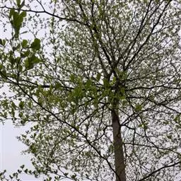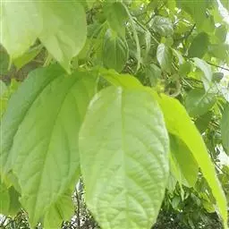 落叶大乔木,落叶前变为黄棕色,高达25米。树皮灰色,块状脱落,光滑,具有板状根。单叶,近对生,叶片矩状椭圆形,长5-14厘米,宽2-45厘米,薄革质,无毛,基部不对称,叶缘具钝锯齿,顶端钝形或钝尖,基部圆形或心形;叶柄长0.5-1.2厘米,常具2腺点。