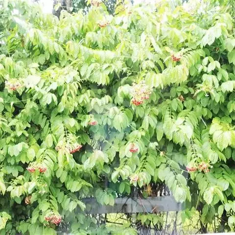 花两性,总状花序,呈黄白色,花萼钟状,5裂,无花瓣;雄蕊10枚,2轮排列;子房下位,1室,常有胚珠3颗。闭合果,果长2.3-3.5厘米,果皮纤维状木质,有5硬翅,有许多弯曲脉状条状。花期3-6月,果期9-11月。