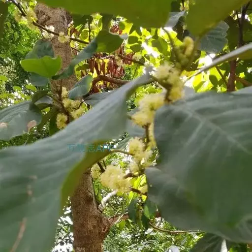 伞形花序簇生叶腋,总梗极短;每一花序有花4-6朵或更多;花序 总梗长4-6毫米;苞片膜质;花梗长6-7毫米,有锈色柔毛;雄花花被片5-6,披针形, 长2.5毫米,黄白色;能育雄蕊9,花丝纤细,有柔毛,腺体有柄;雌花较小;花被裂片长圆形,长1.5毫米,退化雄蕊有柔毛;子房卵形,无毛。果长卵形,长约7毫米,直径5毫米;果托浅碟状,果梗长1厘米。花期11月至翌年5-6月,果期6-7月。