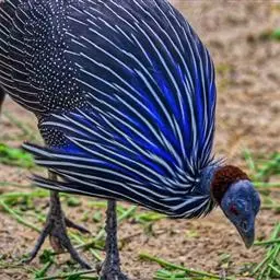 鹫珠鸡:是珠鸡科中体形最大的一种,因头颈部像兀鹫而得名。雌雄羽色相似,为黑色基底上遍布白色点斑,…