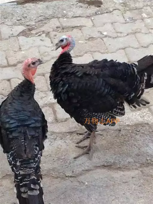 颈、足像鹤,嘴尖冠红且软,毛色如青羊,脚有两指,爪甲锋利,能伤人至死。墨西哥的普通火鸡亚种与美国东南和西南部的普通火鸡在羽毛斑点和腰部颜色上稍有差别,但羽衣基本上都是黑色,并带有虹彩光泽的青铜色和绿色。成年雄体头部裸露,有皮瘤,一般情况下呈鲜红色,但兴奋时变成白色,带亮蓝色。普通火鸡的其他明显特征是从额至喙有一个长形红色肉质饰物;喉部有肉垂,胸部具有一个黑色、质地较粗、似被毛的羽簇,称为髯,有脚距突起。雌鸟的重量一般只有雄鸟的一半,头部的皮瘤及肉垂也较小。 [1-2]