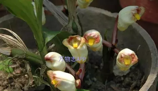 花葶肉质而肥厚,长15-20厘米,基部具数枚宽卵状披针形的鳞片状鞘;总状花序具3-4朵花;花苞片深茄紫色,凹陷,卵形或长圆形,长2-2.5厘米,先端急尖;花梗和子房浅茄紫色,长3-4厘米;花白色或稻草黄色,内面在中部以上具紫褐色斑点;中萼片近椭圆形,长2-2.5厘米,宽1厘米,上部外折,先端钝,具7条脉,侧萼片斜三角形或镰刀状长圆形,比中萼片长,上部外折,先端钝,基部歪斜而贴生在蕊柱足上,具7条脉;萼囊短而宽钝。