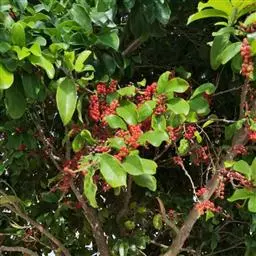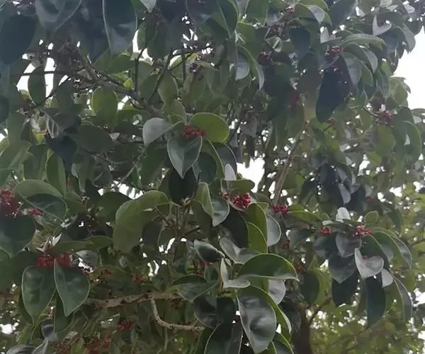 铁冬青(Ilex rotunda Thunb.),别名救必应、熊胆木、白银香、白银木、过山风、红熊胆、羊不食、七星香、万紫千红等,为冬青科亚热带常绿灌木或乔木,高可达20米,胸径达1米;树皮灰色至灰黑色;叶薄革质,椭圆形、全缘,叶面有光泽;花小,黄白色,芳香;雌雄异株,通常4-7朵排成聚伞花序,腋生或生于当年小枝上,果球形,6-8mm大小,熟时红色;花期3一4月,果熟期10-12月。 生于海拔400~1100米的山坡常绿阔叶林中和林缘,野外一般多生于湿润肥沃的山间林缘和向阳山坡或溪谷两旁。喜温暖湿润的气候。铁冬青分布于长江流域以南、台湾,朝鲜、日本等地也有。