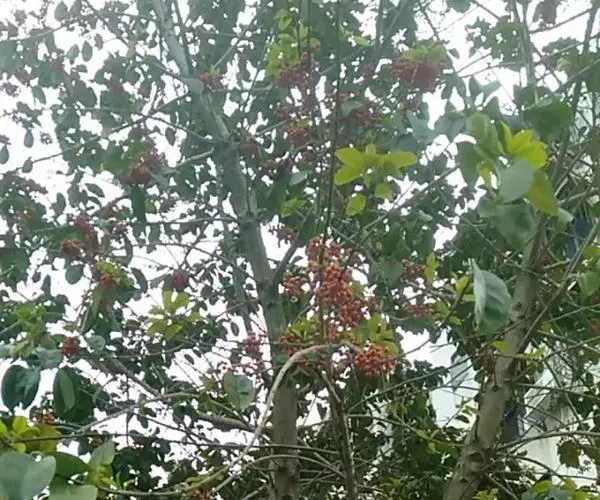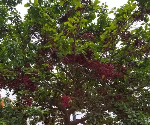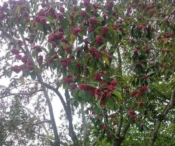 果近球形或稀椭圆形,直径4-6毫米,成熟时红色,宿存花萼平展,直径约3毫米,浅裂片三角形,无缘毛,宿存柱头厚盘状,凸起,5-6浅裂;分核5-7,椭圆形,长约5毫米,背部宽约2.5毫米,背面具3纵棱及2沟,稀2棱单沟,两侧面平滑,内果皮近木质。花期4月,果期8-12月。