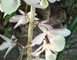 喉红石斛:附生。茎丛生,直立,粗短,近棒状纺锤体。叶2-4枚,生于茎顶。总状花序顶生,花序轴长5-…