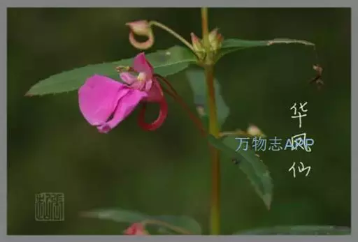 华凤仙(学名:Impatiens chinensis Linn.):凤仙花科,凤仙花属一年生草本植物,高可达60厘米。茎纤细,无毛,叶对生,叶片硬纸质,稀倒卵形,上面绿色,被微糙毛,下面灰绿色,无毛,花较大,1-3朵簇生于叶腋,紫红色或白色;苞片线形,唇瓣漏斗状,旗瓣圆形,翼瓣无柄,花丝线形,花药卵球形,子房纺锤形,蒴果椭圆形,种子黑色圆球形有光泽。
