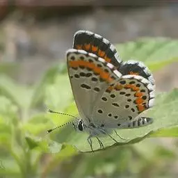 橙灰蝶Lycaena dispar Hauorth,鳞翅目、灰蝶科。这类蝴蝶雌雄异型,雄蝶前翅翅面…