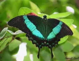 巴黎翠凤蝶中型凤蝶,躯体黑褐色,散布绿色亮鳞。后翅M3脉端有一明显叶状尾突。翅背面底色黑褐色,密布…