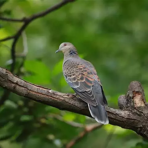 山斑鸠,是鸽形目鸽鸠科斑鸠属鸟类,又名金背斑鸠、棕背斑鸠、山鸠、金背鸠、麒麟斑、麒麟鸠、东方斑鸠、绿斑鸠、山鸽子。山斑鸠颈侧具明显黑白色条纹的块状斑,上体深褐色、具扇贝状斑纹,羽缘棕色,尾羽近黑色,下体多偏粉色。虹膜黄色,喙灰色,脚粉色。山斑鸠是留鸟,在中国常见且分布广泛。此外,还分布于不丹、尼泊尔、巴基斯坦、印度、日本等国。栖息于针阔混交林、季风常绿阔叶林、果园及农耕区,多成对活动于开阔农耕区、村舍、寺院周围及防火林带。取食于地面,主要觅食植物种子、果实、嫩芽等,也吃昆虫。山斑鸠飞翔时鼓翼快速,叫声为反复而低沉的“咕咕咕”声。繁殖期在4-7月,营巢于林中树上,通常一年繁殖2窝,窝卵数2枚,由雌雄亲鸟轮流孵卵,孵化期18~19天。山斑鸠的肉、卵可食,肉入药可益气明目、强筋壮骨,治久病气虚、衰弱无力、两目昏暗等病症。山斑鸠啄食杂草种子,对农田清除杂草有益;但有时也刨食农作物及树的种子。山斑鸠