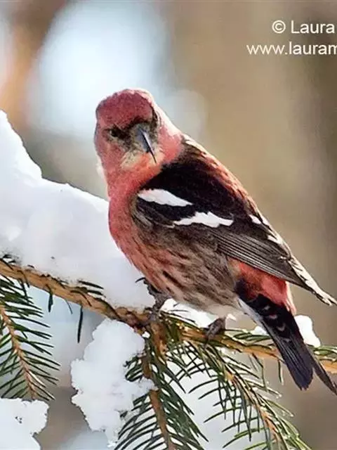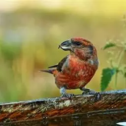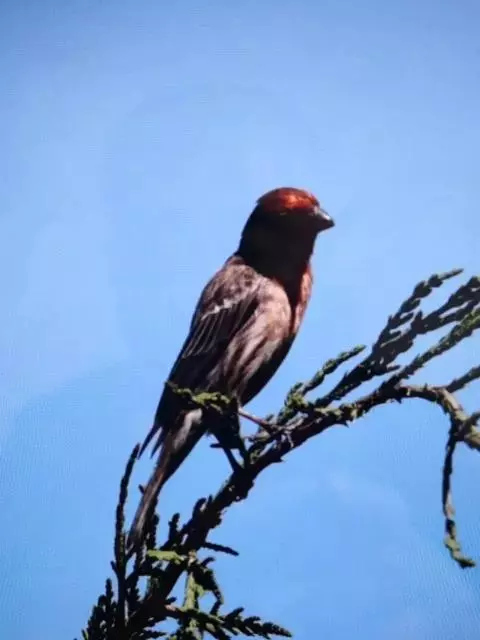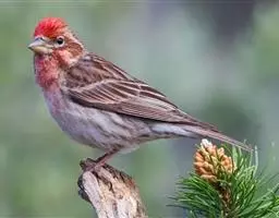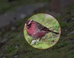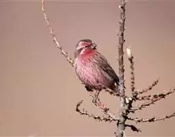 红腰朱雀:体长12-14厘米,小型鸟类。雄鸟前额和眉纹玫瑰粉红色,头顶和一宽的贯眼带深红褐色,背红…
